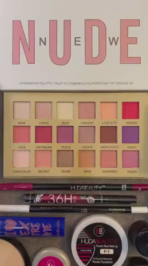 Eyeshadow Kit, Makeup Fixer, Compact Face Powder, Liquid Foundation, Primer, TV Paint Stick, Lip Pencil, Eye Pencil, Setting Loose Powder, Foundation, Concealer, Peel Off Nail Polish, Eyeliner, Mascara, Beauty Blender