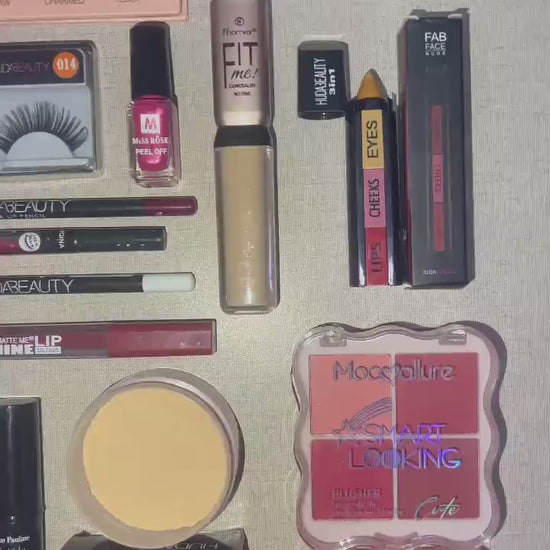 Foundation, Primer, Eyeshadow Kit, Makeup Fixer, Beauty Blender, Eyelashes, 2 Lip Pencil, Eyeliner, Peel Off Nail Polish, Concealer, 2 Blusher Highlighter Kit, Setting Loose Powder, Mascara
